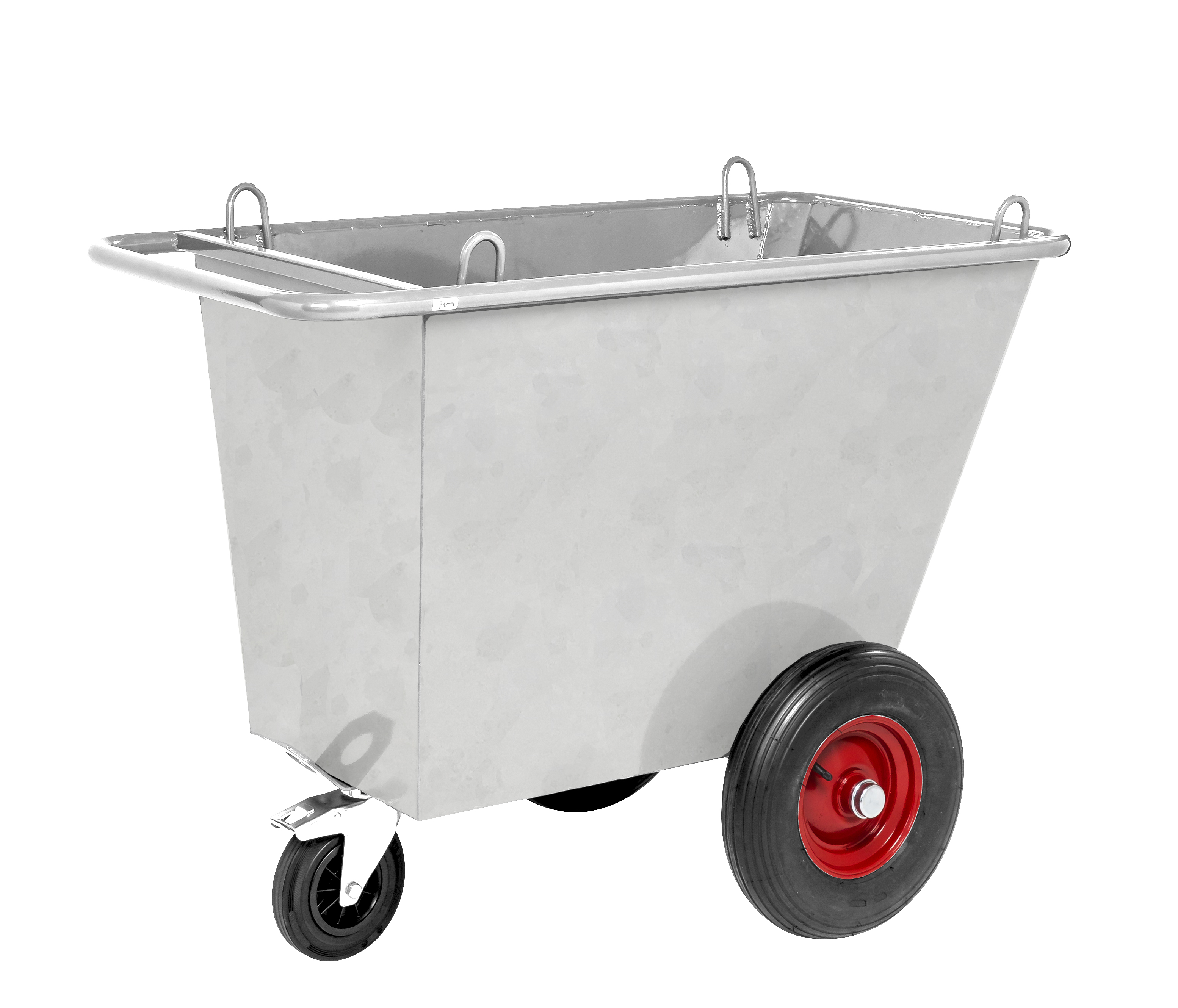 Carro para desechos con planchas de metal gruesas recubiertas. Los brazos elevadores cuentan con el marcado CE.