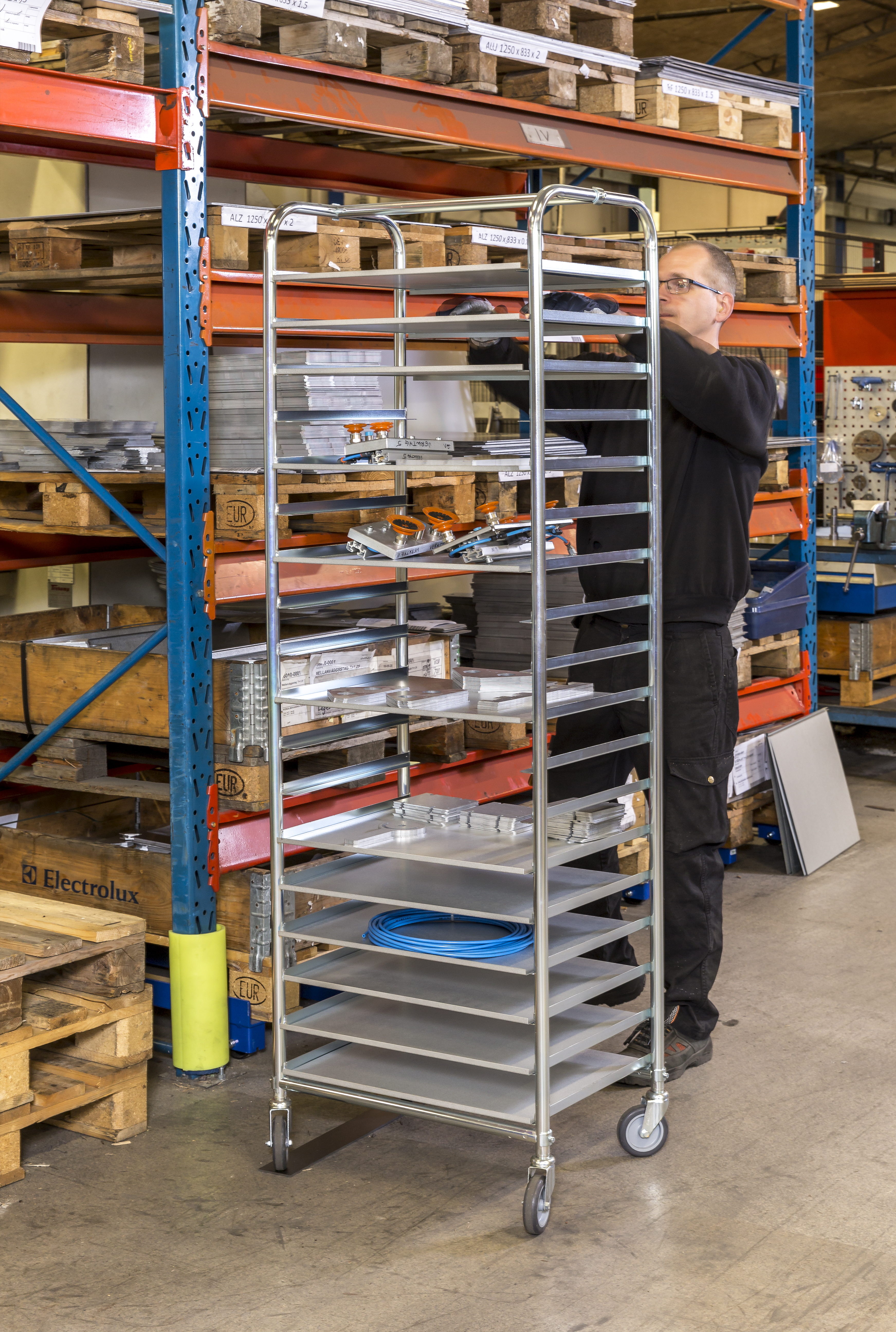 Electrogalvanizado con tubo de acero de 25 mm Apto para bandejas de 540x440 mm Para 18 bandejas 4 ruedas con pivotes giratorios, 100 mm Capacidad: 150 kg